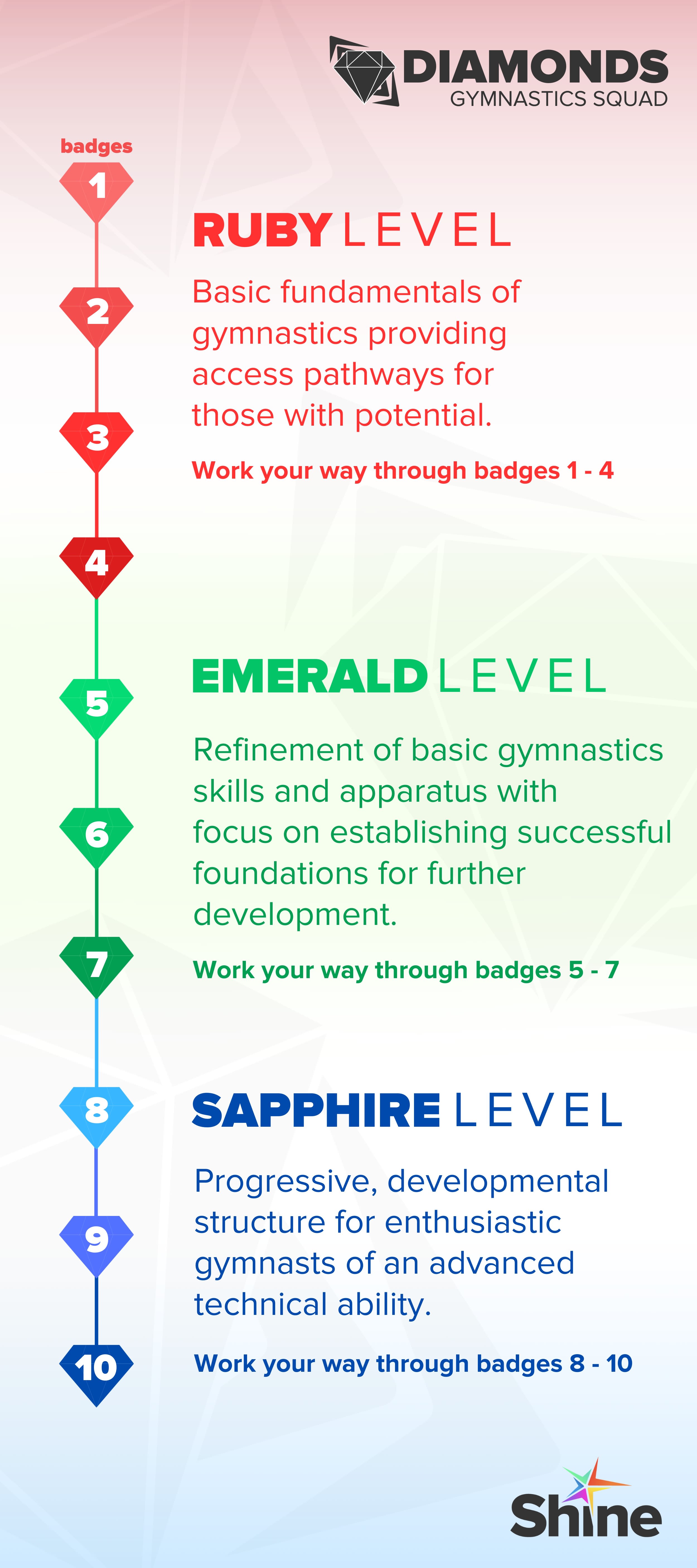 This programme is aimed at enthusiastic, talented gymnasts of a high technical ability who wish to progress through the latter stages of the Shine Diamonds progressive framework.